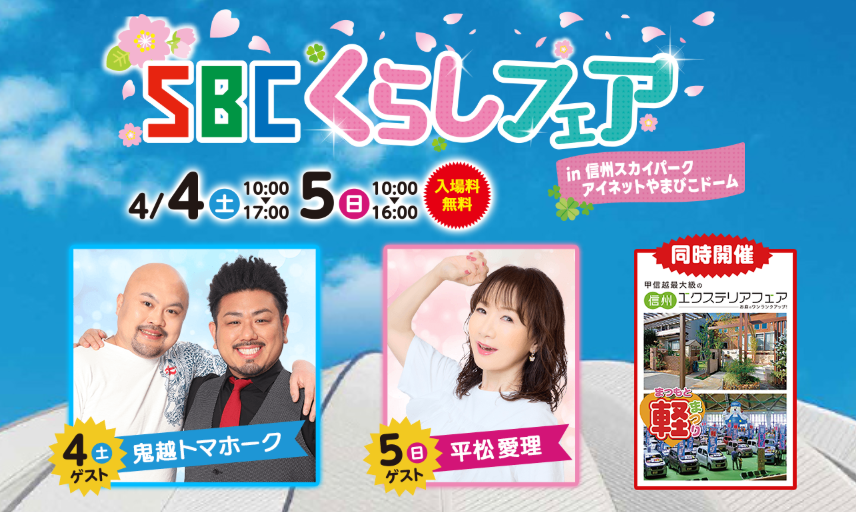昨年ご好評をいただきました「SBCくらしフェア~同時開催 信州エクステリアフェア・まつもと軽まつり~」に今年も参加いたします。当社は総合人材サービスの会社となりますが、ご来場の皆さまに楽しんでいただけるよう準備しておりますので、お気軽にお立ち寄りくださいませ!
